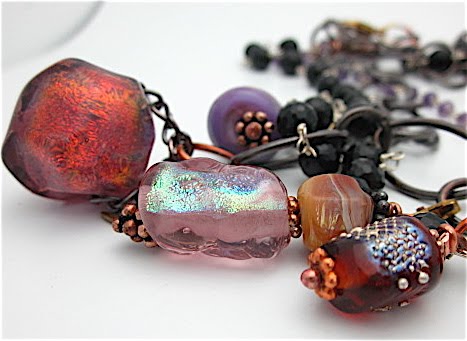 Coins are the inspiration for this necklace. I made a few copper coin charms coupled with glass discs with iridescent edges. I especially like the copper cameo and the big glass ring with embedded silver foil.